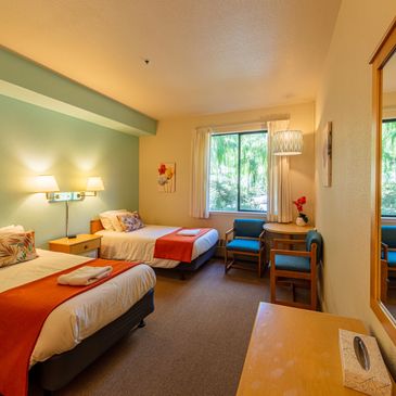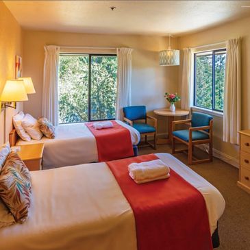 2 twin beds, ensuite bathroom in our Conference Center. Enjoy quiet tranquility (no phone or TV), w/nature views. Room amenities: WiFi, table and 2 chairs, a safe. Bathroom amenities: fragrance-free body products & hairdryer.