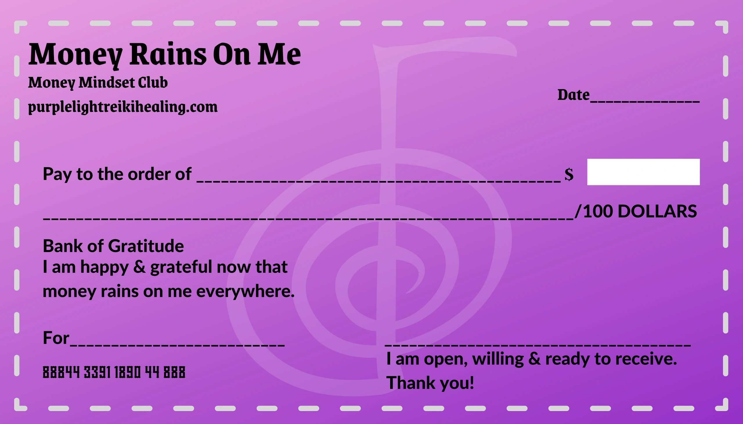 PAY YOURSELF FIRST! SAVE AND PRINT THIS "MONEY RAINS ON ME CHECK" AND WRITE YOURSELF THE AMOUNT OF MONEY YOU WANT TO RECEIVE. YOU CAN PLACE IT INSIDE YOUR WALLET. READ AS MANY TIMES AS YOU CAN. THE KEY TO A FAST MANIFESTATION IS TO BE CONSISTENT.